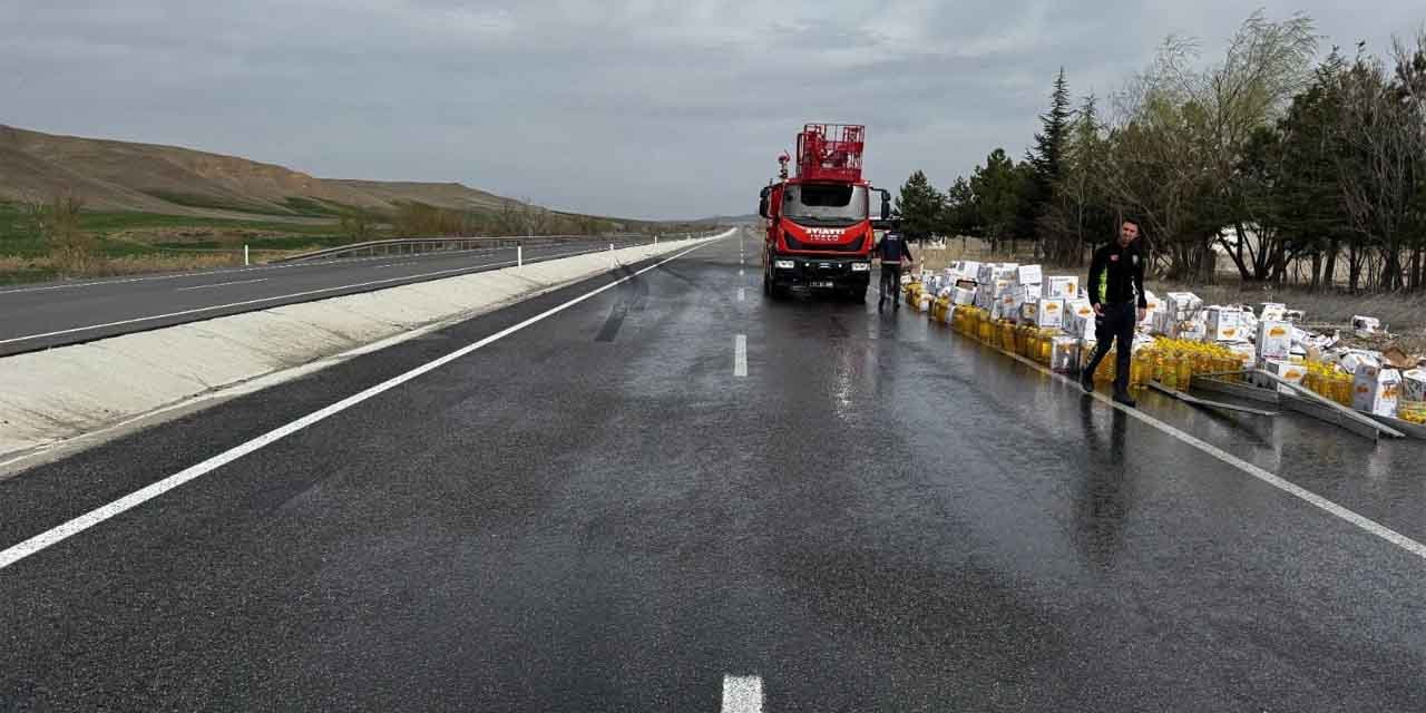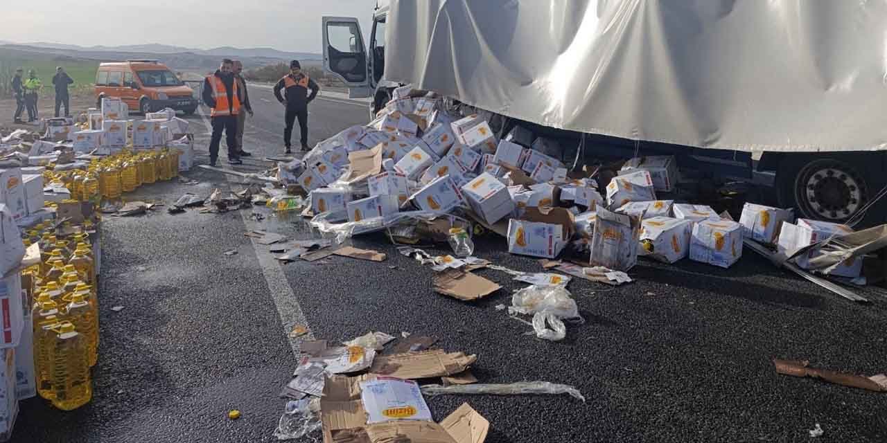 Kırıkkale'de freni boşalan tır, orta refüjü aşarak karşı şeride geçti. Tırdan yola devrilen yağ dolu tenekeleri trafiğin durmasına sebep oldu.