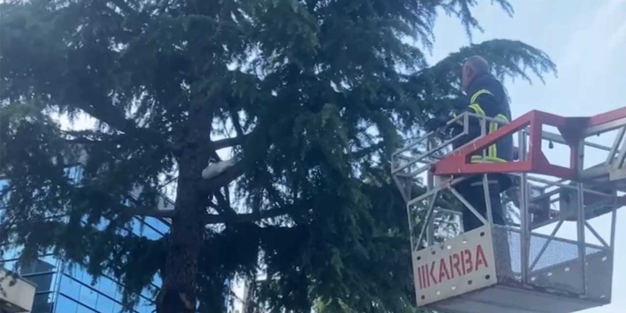 Ağaçta mahsur kalan yavru kediyi itfaiye ekipleri kurtardı